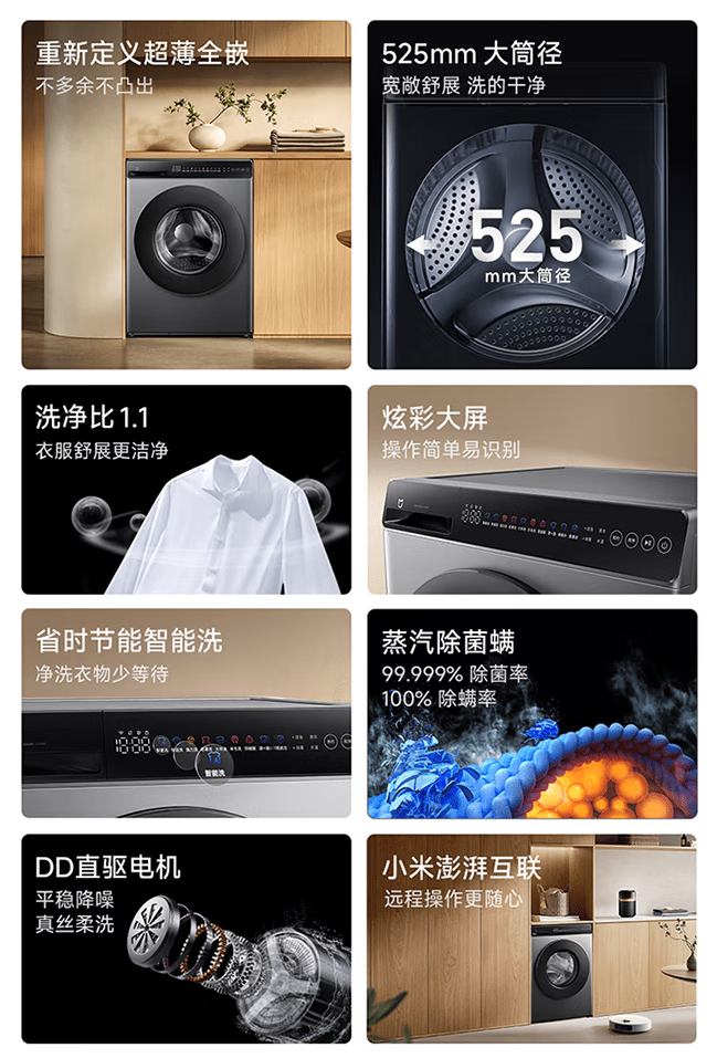 IT之家从官方介绍获悉,这款新品采用超薄全嵌设计、银灰简约外观,配备炫彩显示面板、525mm大筒径,支持1:1洗净比。