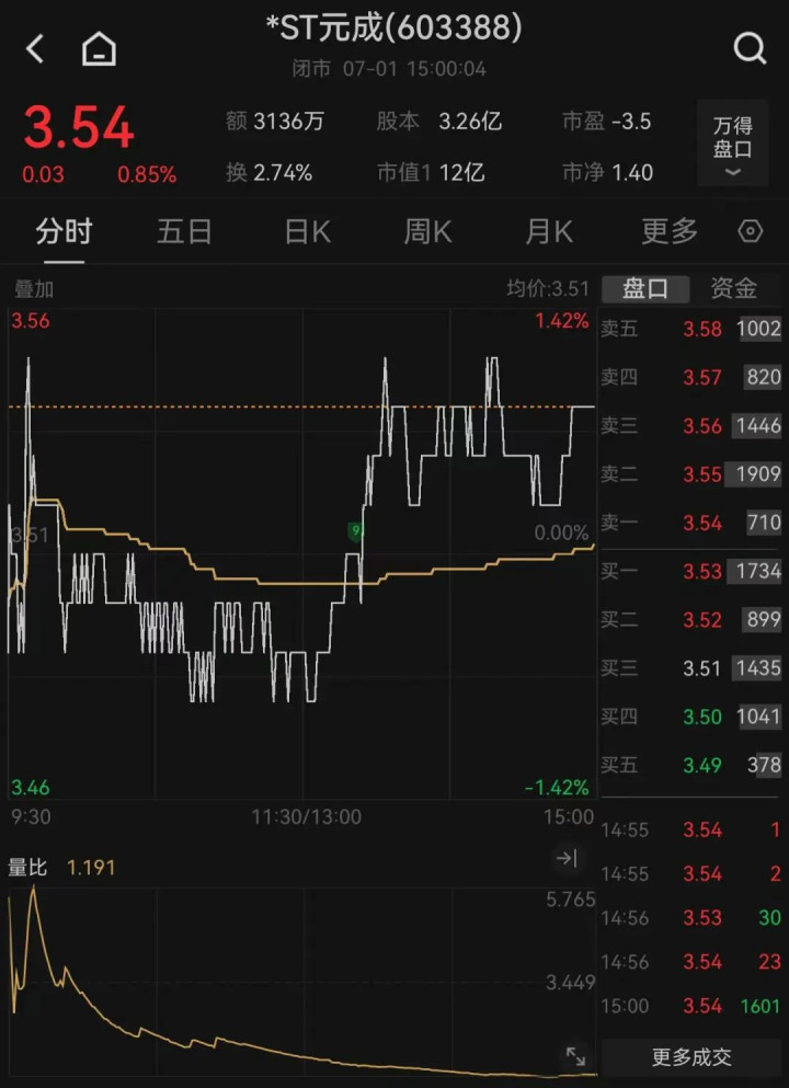 Wind数据显示,截至7月1日收盘,*ST元成股价报3.54元/股,最新市值为12亿元。