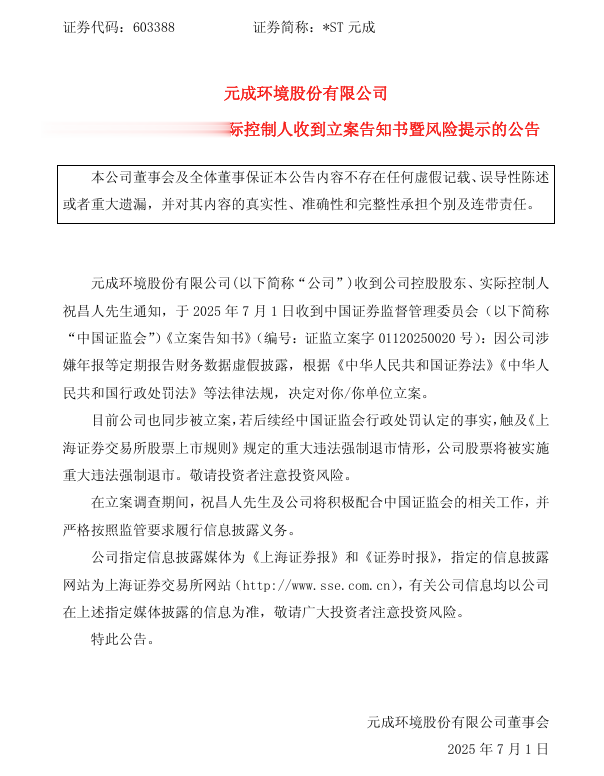 *ST元成公告称,公司收到控股股东、实控人祝昌人通知,于7月1日收到中国证监会《立案告知书》,因公司涉嫌年报等定期报告财务数据虚假披露,根据《中华人民共和国证券法》《中华人民共和国行政处罚法》等法律法规,决定对其立案。